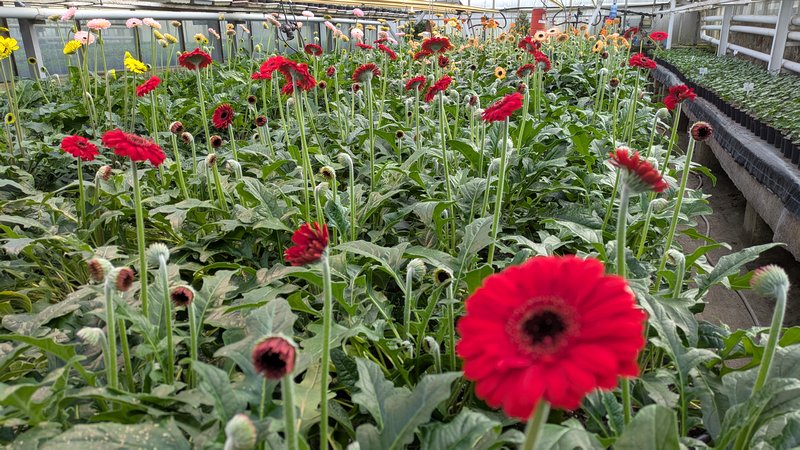 Darunter, von Januar bis April, rund 20 000 Tulpen in unzähligen Farben und Formen und Gerbera, die mit zusätzlichen Licht und Wärme auch im Winter blühen.